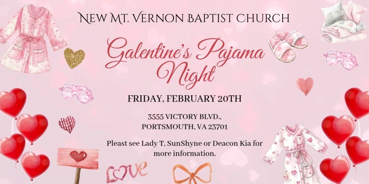 Ladies, you’re invited to our Galentine’s Pajama Night hosted by L.E.A.P. with Faith Ministry at New Mt Vernon Baptist Church — a night of fun, laughter, games, karaoke, and food!